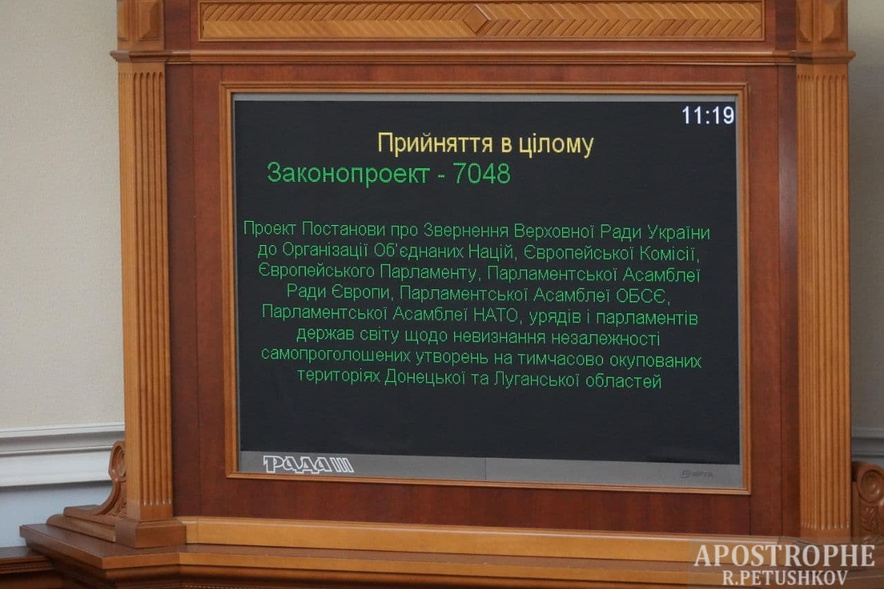 Також Верховна Рада ухвалила проект ухвали про звернення до міжнародних організацій щодо невизнання окупованих Росією районів Донецької та Луганської областей "незалежними державами".