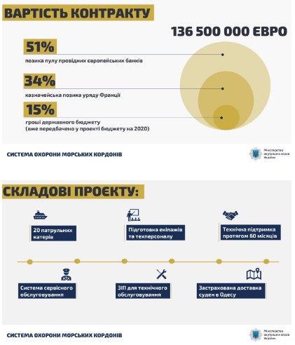 "Проект коштує 136 мільйонів євро. 15% ми платимо одразу з державного бюджету. І 85% - це спеціальний кредит французького казначейства з мінімальними відсотками ... Проект включає систему сервісного обслуговування, підготовку 240 членів екіпажу і 120 чоловік технічного персоналу, запасні частини та інструменти, необхідні для техобслуговування протягом 2 років експлуатації, технічну підтримку в Україні на 60 місяців з дати поставки першого корабля в Україну і страхування", - зазначив Аваков.