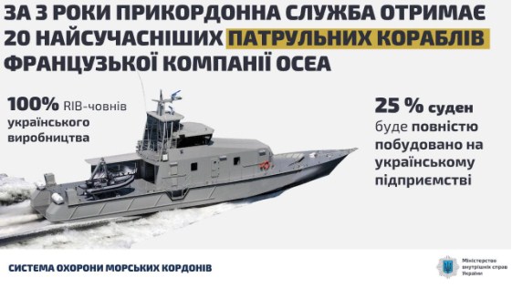 "Від імені уряду України підписали угоду з міністром внутрішніх справ Франції Крістофом Кастанером (136,5 млн євро) про виготовлення та техпідтримку 20 патрульних кораблів, 5 з них і всі RIB-човни побудуємо в Україні", - зазначив міністр.