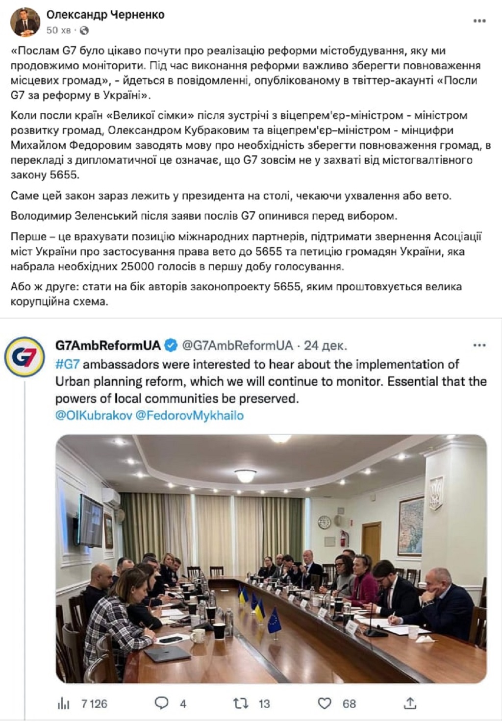 "Коли посли країн "Великої сімки" після зустрічі з віцепрем'єр-міністром - міністром розвитку громад Олександром Кубраковим та віцепрем'єр-міністром – Мінцифри Михайлом Федоровим заводять мову про необхідність зберегти повноваження громад, в перекладі з дипломатичної це означає, що G7 зовсім не у захваті від містогвалтівного закону 5655. Саме цей закон зараз лежить у Президента на столі, чекаючи ухвалення або вето", - пише Черненко.