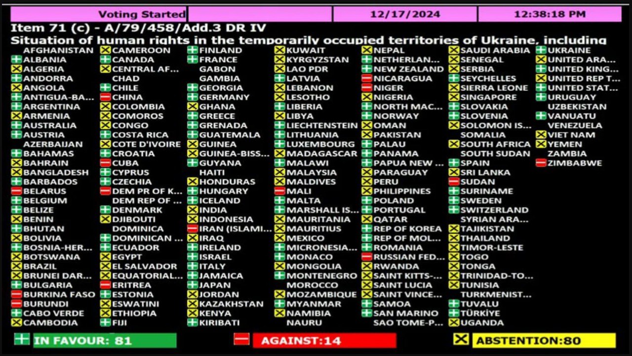 Документ підтримала 81 країна. Втім, 14 країн виступили проти: Росія, Білорусь, Китай, Іран, Північна Корея, Буркіна-Фасо, Бурунді, Еритрея, Куба, Малі, Нікарагуа, Нігер, Судан та Зімбабве.