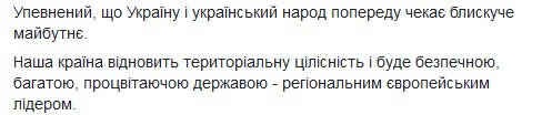 Він також висловив упевненість, що "Україну і український народ попереду чекає блискуче майбутнє".