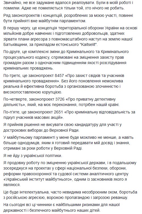 "Я продовжу свою роботу щодо зміцнення української держави, і в подальшому зосереджуся на проектах у сфері національної безпеки, оборони, реформи правоохоронної та судової системи аналітичного центру "Український інститут майбутнього", одним із засновників якого я є. Це буде інтелектуальна, часто невидима неозброєним оком, боротьба з російською агресією, ворожою пропагандою і загрозою реваншу", - зазначив він.