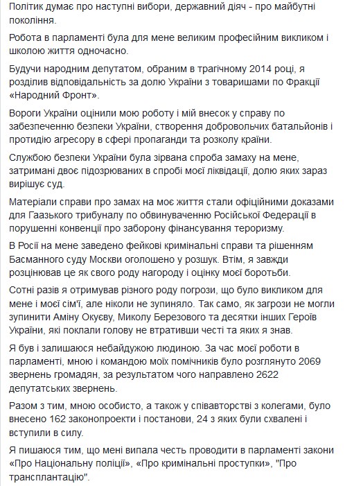 "Я прийняв рішення не висувати свою кандидатуру для участі в дострокових виборах до Верховної Ради. В майбутньому парламенті у мене буде можливо не менше, а навіть більше однодумців, яким я готовий передавати мій досвід і знання, отримані за роки роботи у Верховній Раді", - написав він.