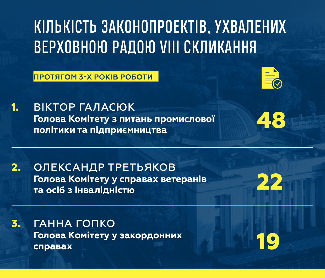 У перші три роки роботи парламенту голова Комітету ВР з питань промислової політики та підприємництва Віктор Галасюк став ініціатором 48 прийнятих законопроектів. Голова Комітету у справах ветеранів та осіб з інвалідністю Олександр Третьяков ініціював 22 прийнятих законопроекти. Голова Комітету у закордонних справах Ганна Гопко ініціювала 19 прийнятих законопроектів.За даними іншого дослідження, проведеного Інститутом публічної політики та консалтингу ІНПОЛІТ, метою якого став аналіз законодавчої активності Верховної Ради протягом VIII сесії у 2018 році, ТОП-10 депутатів Верховної Ради за ефективністю виглядав наступним чином: Ірина Луценко – 4 власних законопроекти + 8 в співавторстві, Олег Ляшко– 3 власних + 6 в співавторстві; Ніна Южаніна – 3 власних + 4 в співавторстві; Михайло Довбенко– 3 власних + 4 в співавторстві; Сергій Пашинський (НФ) – 2 власних + 6 в співавторстві; Андрій Вадатурський – 3 власних + 3 в співавторстві; Ірина Геращенко– 2 власних + 5 в співавторстві; Олександр Третьяков – 3 власних + 2 в співавторстві; Олег Кулініч– 2 власних + 4 в співавторстві, Максим Бурбак – 0 власних + 7 у співавторстві.