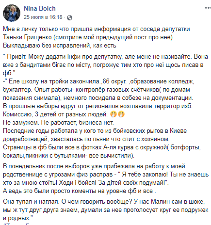 "Ледве школу на трійки закінчила, 66 округ, освіта коледж, бухгалтер. Досвід роботи-контролер газових лічильників (по домівках свідчення знімала), трохи посиділа в Радбезу на документації. У минулі вибори раптом від регіоналів очолила территор. виб. комісію, 3 дітей від різних людей, незаміжня. Не працює, бізнесу не має", - цитує автор поста слова джерела.