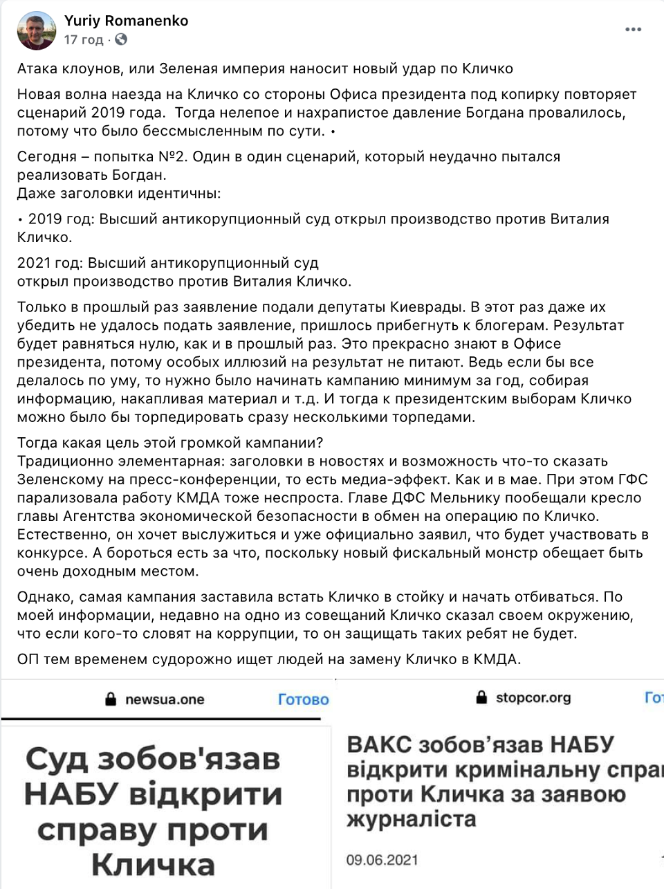 "Нова хвиля наїзду на Кличка з боку Офісу президента повністю повторює сценарій 2019. Тоді безглуздий і нахабний тиск Богдана провалився, бо був беззмістовним, по суті. Сьогодні - спроба №2. Один в один сценарій, який невдало намагався реалізувати Богдан. Тільки минулого разу заяву в ВАКС подали депутати Київради. Цього разу навіть їх не вдалося переконати подати заяву, довелося вдатися до блогерів", - написав Романенко.