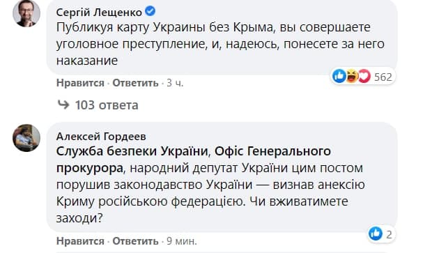 Народний депутат України від партії "Опозиційна платформа - За життя" Вадим Рабинович опублікував допис, який проілюстрував картою України без анексованого Росією Криму. В мережі нардепу вказали, що таким чином він визнав анексію Криму і скоїв кримінальний злочин.