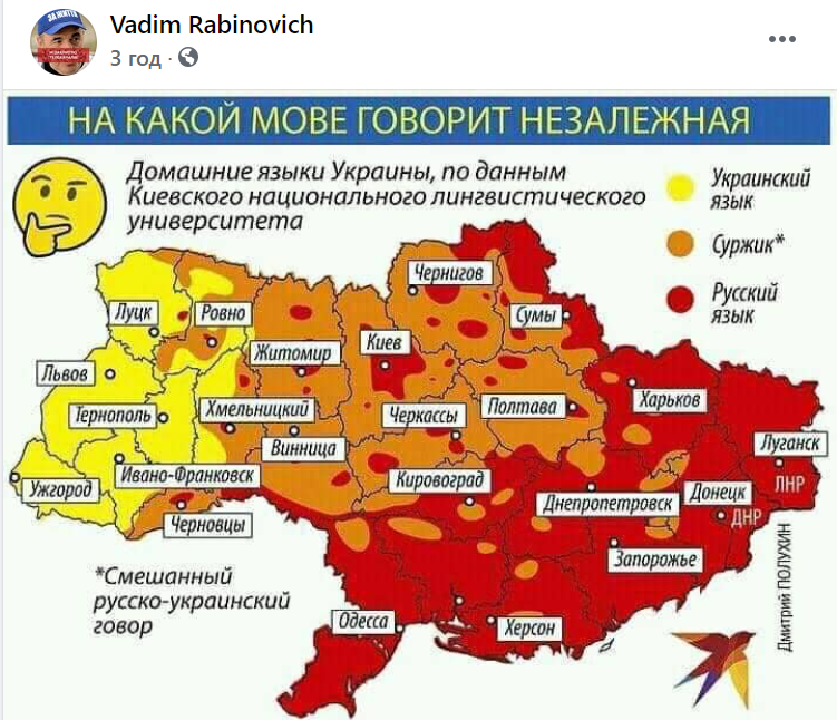 Так, Рабинович опублікував допис про поширення української мови в різних регіонах України і додав карту України без анексованого Криму авторства російських пропагандистів.