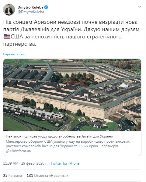 Відзначимо, що віце-прем'єр-міністр України з питань європейської та євроатлантичної інтеграції Дмитро Кулеба публічно на своїй Twitter-сторінці подякував США за ще одну партію Javelin для України.