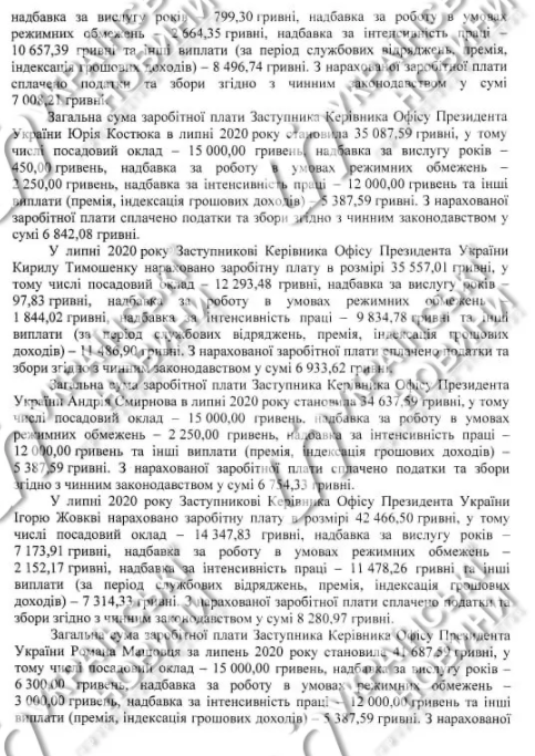 Інші заступники глави ОПУ заробили в липні менше свого керівника: Юлія Ковалів - 32 136 гривень, Андрій Смирнов - 34 638, Юрій Костюк - 35 088, Кирило Тимошенко - 35 557, Юрій Машовець - 41 688, Ігор Жовква - 42 467.