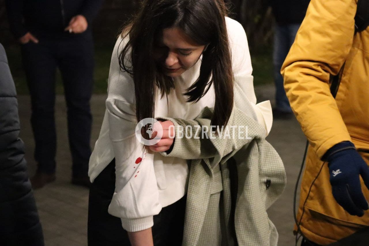 Охорона президента жорстко відтісняла журналістів, розштовхуючи їх у різні боки. Одна журналістка впала на асфальт і поранилася. У постраждалої була помітна кров на руках.
