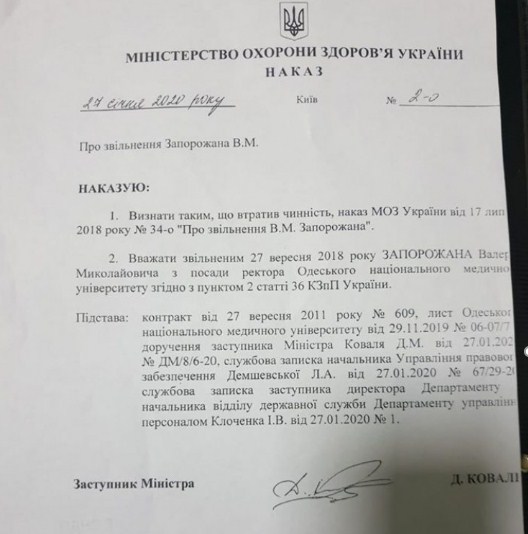 Міністерство визнало указ за підписом Супрун від 17 липня 2018 року про звільнення ректора ОНМедУ таким, що втратив чинність. Новим указом міністерство звільнило Запорожана 27 вересня 2018 року, тобто у зв'язку із закінченням терміну його контракту, а не через порушення.