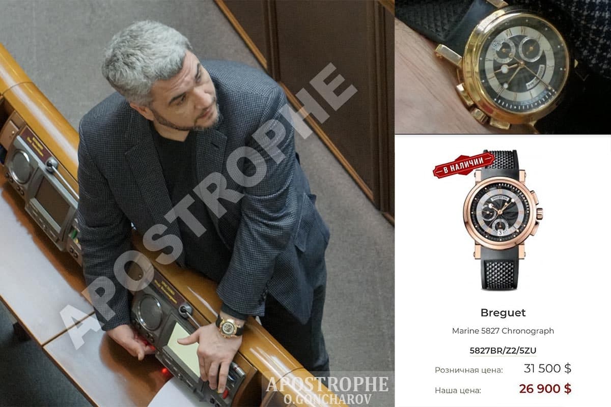 Урбанський на засіданні Ради 30 березня "засвітив" годинник Breguet Marine 5827 Chronograph, який в одному з інтернет-магазинів коштує 31 500$ (близько 750 тисяч гривень). За таку ціну в Києві можна придбати квартиру.
