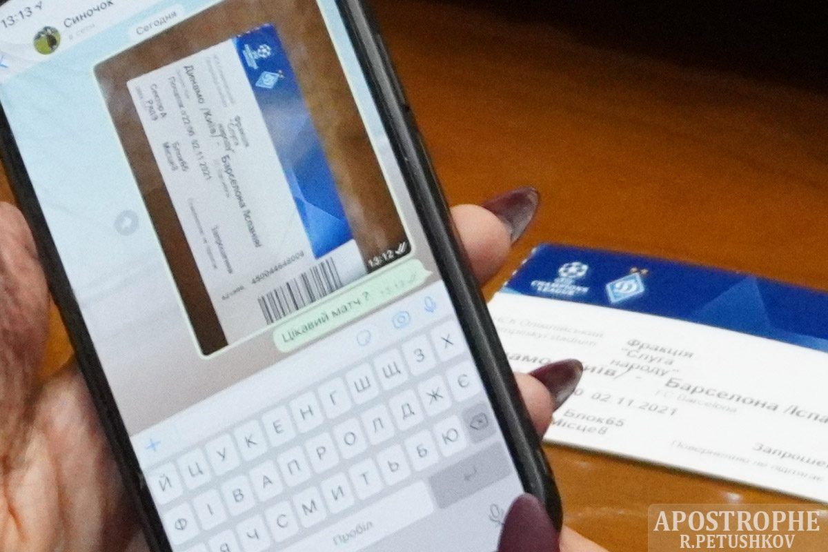 На кадрах, зроблених у сесійній залі Верховної Ради, видно, як деякі нардепи фотографують наявні в них квитки на футбольний матч – вони отримали їх безкоштовно.