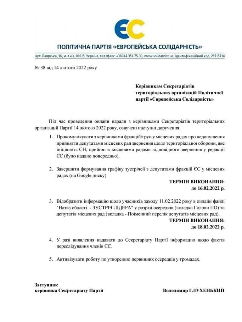 Партія Петра Порошенка "Європейська солідарність" надіслала своїм місцевим організаціям офіційний лист із вимогою блокувати у місцевих радах будь-які ініціативи від "Слуги Народу" щодо розвитку та посилення територіальної оборони.