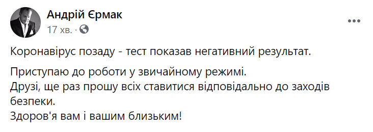 "Коронавірус позаду - тест показав негативний результат. Приступаю до роботи у звичайному режимі", - написав глава ОПУ і закликав українців відповідально ставитися до заходів безпеки.