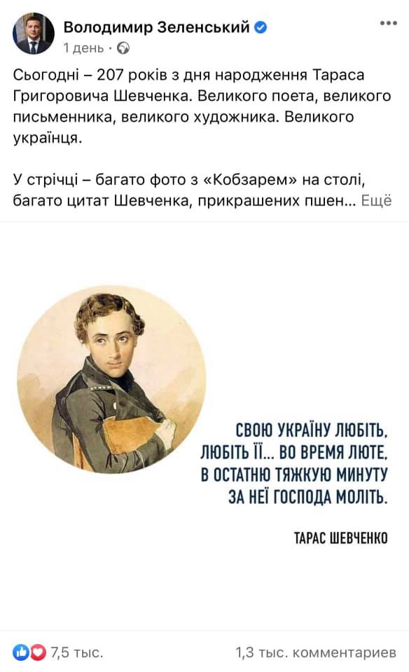 Прес-служба президента України Володимира Зеленського проілюструвала пост на Facebook-сторінці до 207-ї річниці від дня народження Тараса Шевченка цитатою поета і портретом його роботи.
