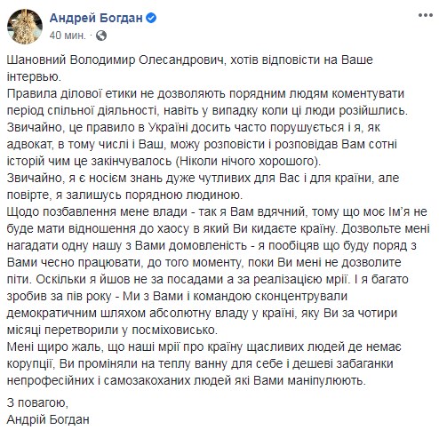 "Про позбавлення мене влади - так я Вам вдячний, тому що моє ім'я не буде мати відношення до хаосу в який Ви кидаєте країну. Дозвольте мені нагадати одну нашу з Вами домовленість - я пообіцяв що буду поруч з вами чесно працювати, до того моменту, поки мені не дозволите піти. Оскільки я йшов не за посадами, а за реалізацією мрії. І я багато зробив за півроку - Ми з Вами і командою сконцентрували демократичним шляхом абсолютну владу в країні, яку Ви за чотири місяці перетворили на посміховисько", - написав Богдан.