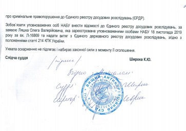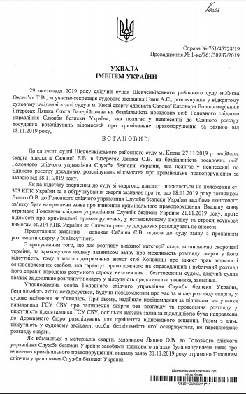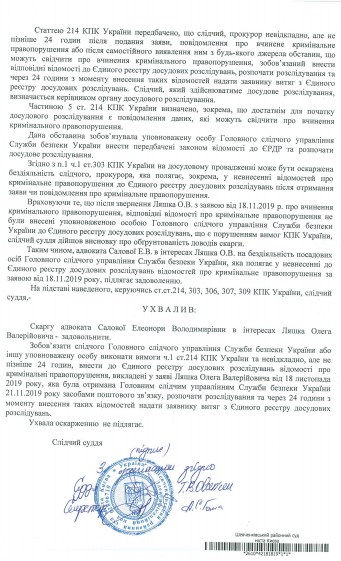 "Зобов'язати слідчого Головного слідчого управління СБУ або інша уповноважена особа виконати вимоги ч. 1 ст. 214 КПК України і не пізніше 24 годин, внести в ЄРДР відомості про кримінальні правопорушення, викладені в заяві Олега Ляшка від 18 листопада, яке було отримано Головним слідчим управлінням СБУ 21.11.2019 року засобами поштового зв'язку, почати розслідування і через 24 години з моменту внесення відомостей надати заявнику виписку з ЄРДР", - наголошується в постанові Шевченківського райсуду Києва.