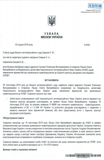 "Зобов'язати уповноважених осіб НАБУ внести відомості до Єдиного реєстру досудових розслідувань, за заявою Ляшка Олега Валерійовича, зареєстрованого уповноваженими особами НАБУ 18 листопада", - йдеться у постанові суду від 3 грудня.