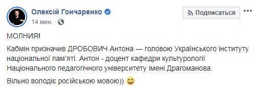 У середу, 4 грудня, в Кабінеті міністрів прийняли рішення призначити новим главою Українського інституту національної пам'яті Антона Дробовича.