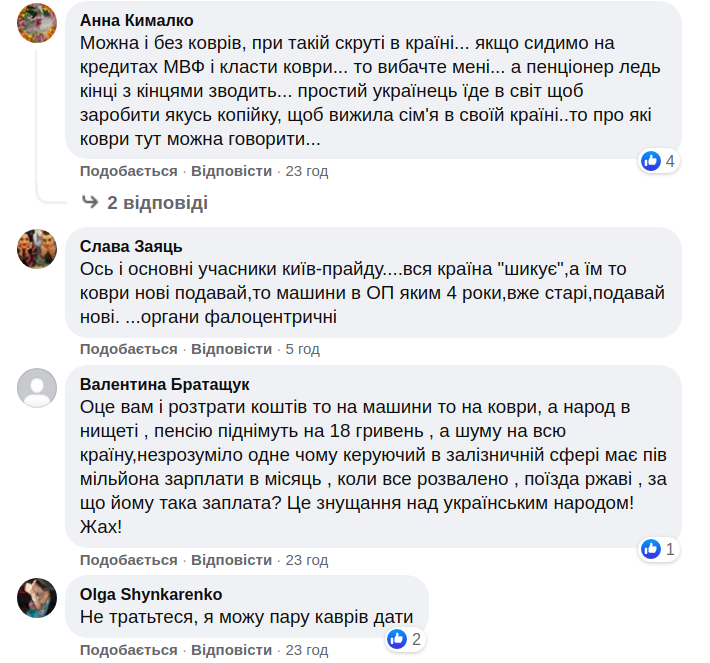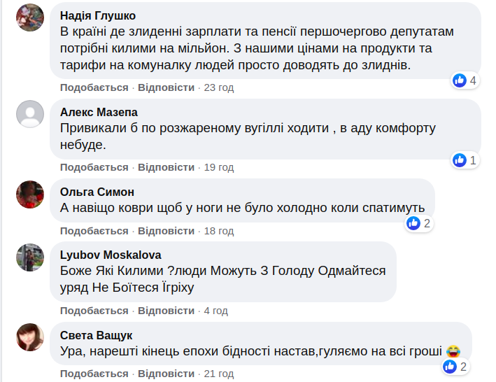 Користувачі соцмереж шоковані цинізмом влади, яка дозволяє собі витрачати мільйон на килими для нардепів в той час, коли український народ доведено до злиднів.