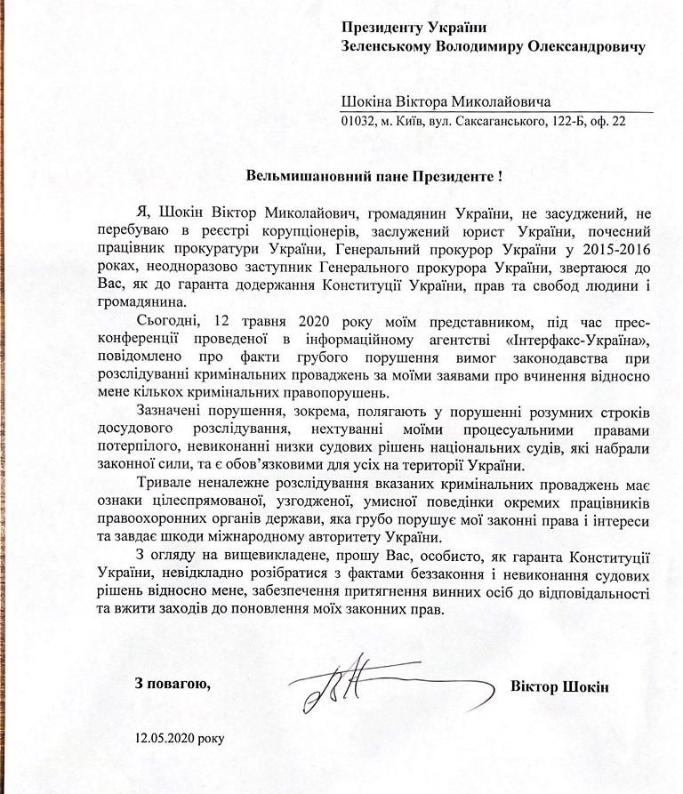 "Віктор Шокін вважає, що тривале неналежне розслідування виробництв з його заяв має ознаки цілеспрямованої, узгодженої, умисної поведінки окремих працівників правоохоронних органів, грубо порушує його законні права та інтереси і завдає шкоди міжнародному авторитету України. У зверненні до президента Шокін просить Зеленського, як гаранта Конституції, особисто розібратися з фактами невиконання судових рішень щодо нього, забезпечити притягнення винних до відповідальності та вжити заходів щодо відновлення його прав", - повідомив він.