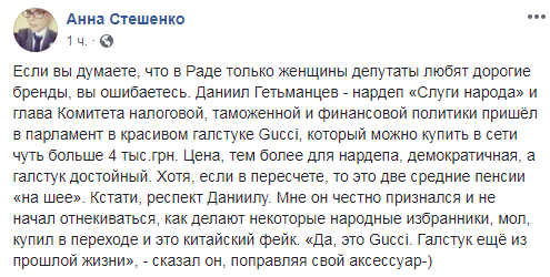 "До речі, респект Данилу. Мені він чесно зізнався і не почав відмовлятися, як роблять деякі народні обранці, мовляв, купив в переході і це китайський фейк. "Так, це Gucci. Краватка ще з минулого життя", - сказав він, поправляючи свій аксесуар", - підкреслила журналістка.