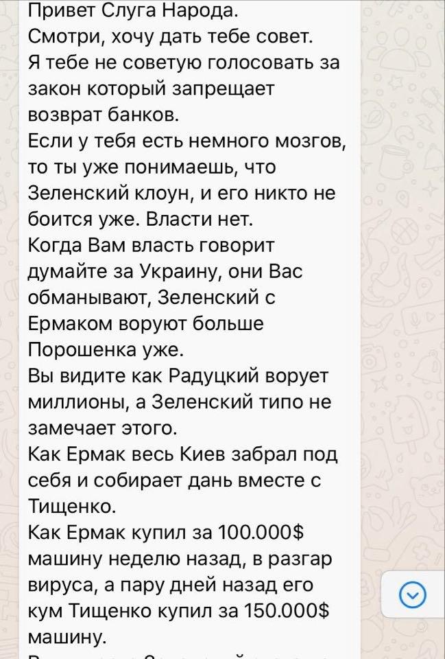 У цьому повідомленні депутатам від "Слуги народу" радять не голосувати за закон про заборону повернення банків екс-власникам, звертаючи увагу на відсутність реальної влади у президента України Володимира Зеленського.