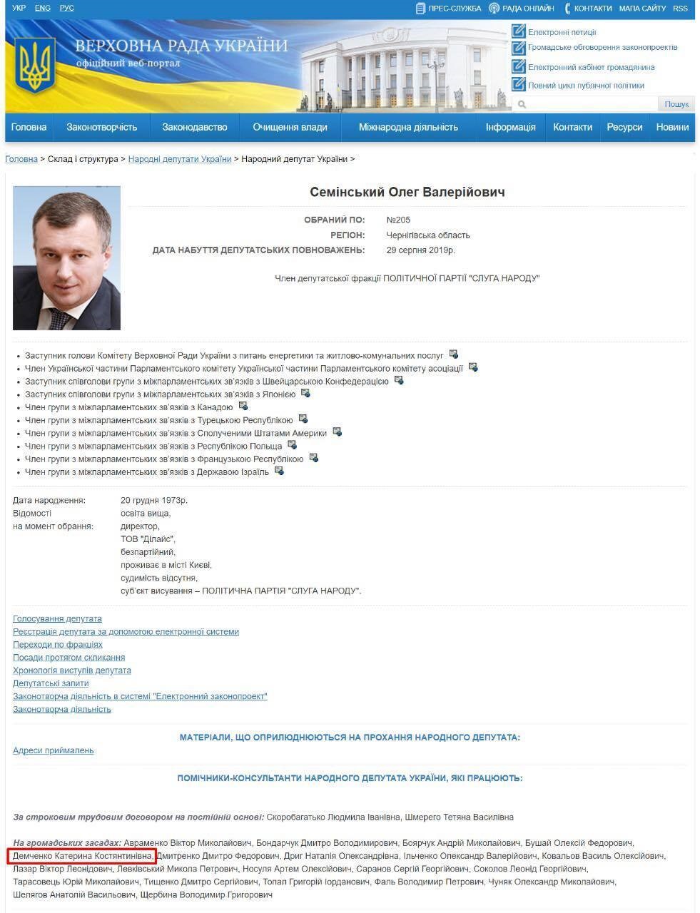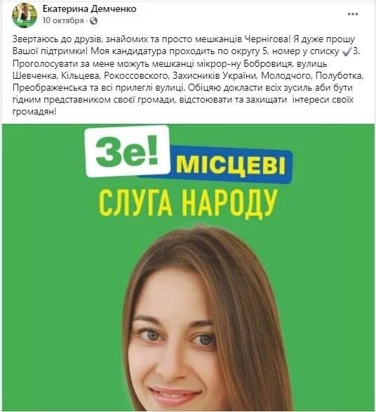 Минулої осені партія "Слуга народу" висунула Катерину Демченко кандидатом на місцевих виборах в Чернігові, який і представляє у Верховній Раді Семінський.