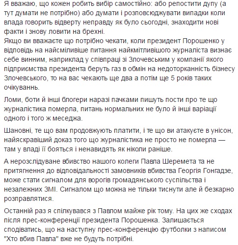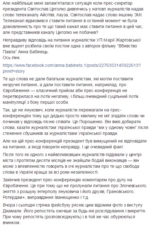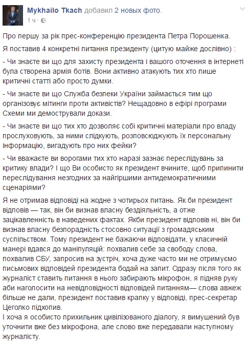 "Також підтримую пост Михайла Ткача. А наші журналісти, колишні на прес-конференції також розповіли, що Ткачу Цеголко не дав дозадать питання! такого не було навіть при Януковичі. Тоді як відомо, журналісти самі займали чергу біля мікрофонів і стояли біля мікрофона, маючи можливість вести з президентом діалог!", - зазначила вона.