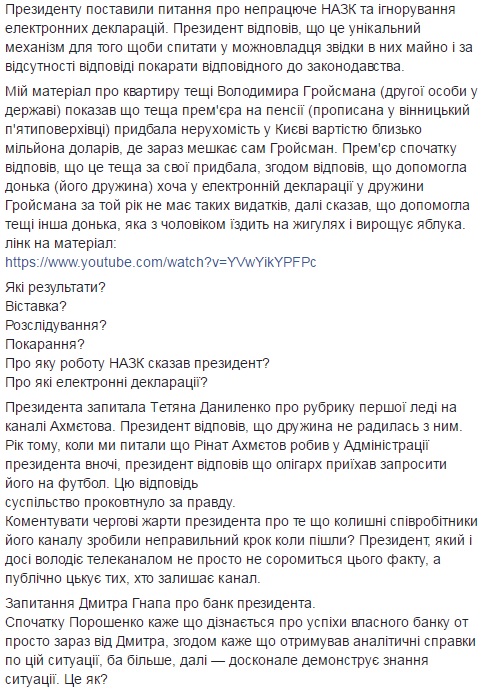 Він підкреслив, що Порошенко не відповів ні на одне з чотирьох поставлених ним питань, а також проігнорував запитання інших журналістів про роботу Національного агентства з питань запобігання корупції і банку, яким володіє президент України.