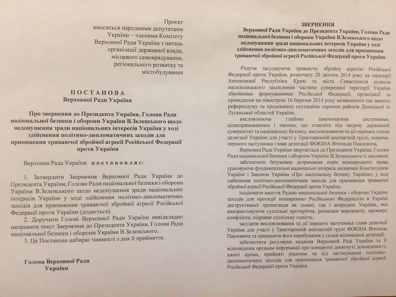 Депутати вимагають виключити з Тристоронньої контактної групи першого заступника голови української делегації ТКГ Вітольда Фокіна, який висловився про війну на Донбасі.
