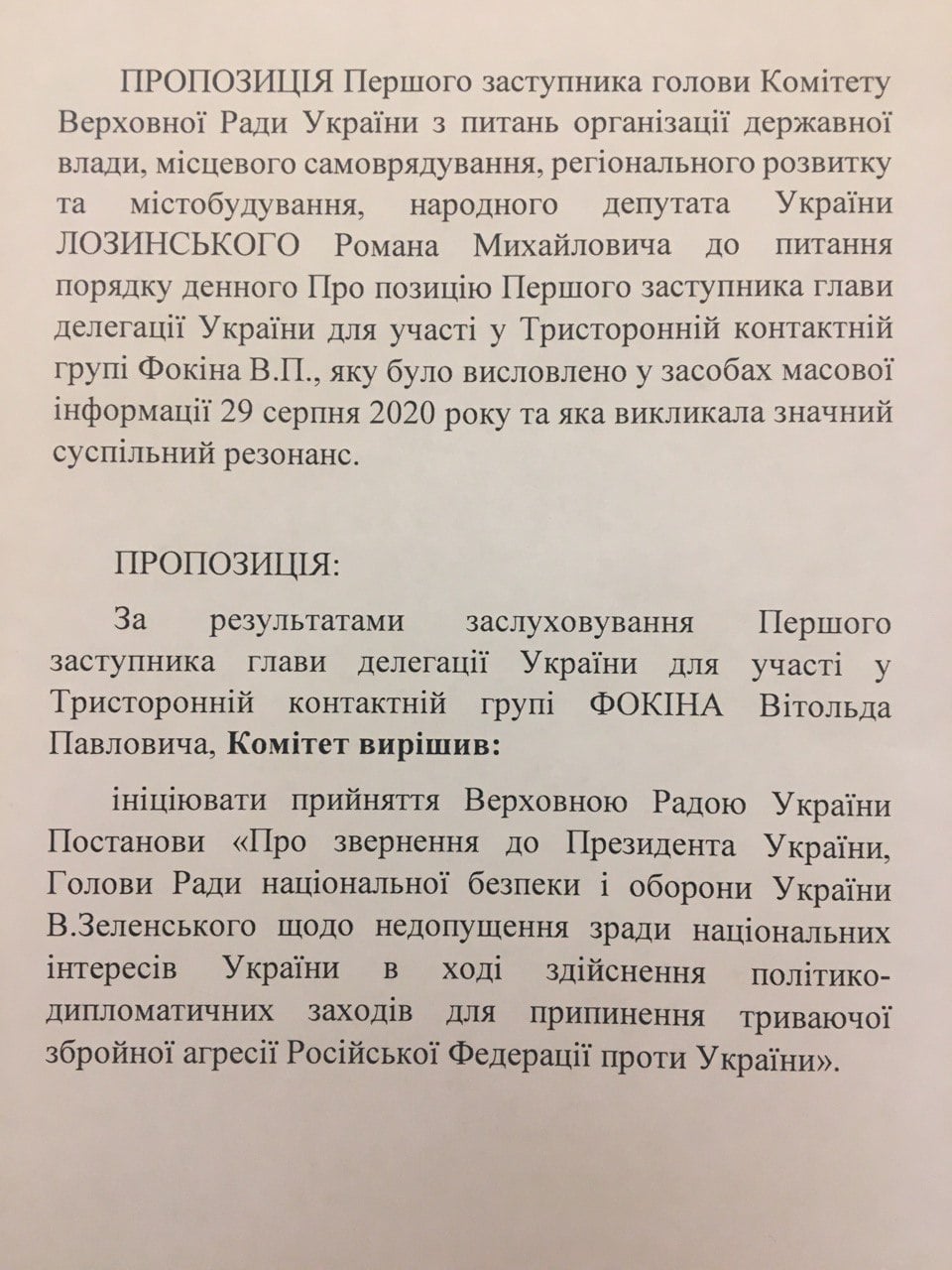 Так, депутат від партії "Голос" Роман Лозинський написав на своїй Facebook-сторінці, що комітет прийняв рішення ініціювати постанову Верховної Ради до президента Володимира Зеленського про недопущення державної зради й виключення Фокіна з ТКГ.