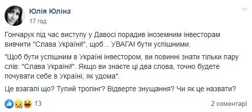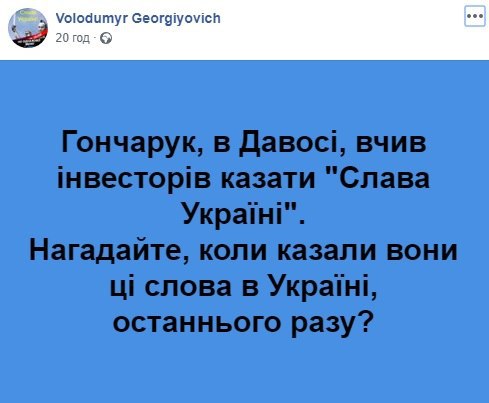 Виступаючи на Ukrainian Breakfast 2020 Гончарук зазначив, що для успіху в Україні потрібно знати слова - "Слава Україні!". Такому гаслу він вчив потенційних інвесторів на форумі.