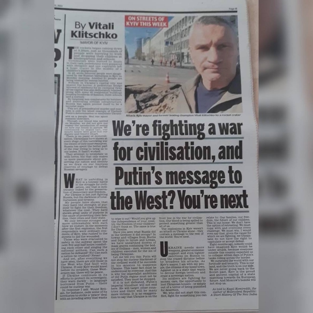 "Чи поступиться, наприклад, Великобританія деякими зі своїх територій, щоб укласти "мирну" угоду з армією, яка вторглася і яка хоче знищити її? Ви відмовилися б від незалежності своєї країни, від свободи своїх дітей? Я так не думаю. Те саме вірно і для України. Ось що я вам скажу: Путін не припинить свого ядерного шантажу цивілізованого світу, якщо йому вдасться виконати свою місію щодо придушення України. Імперська кровожерливість Путіна на цьому не закінчиться. Він націлиться на інші країни, і жертв буде набагато більше. Вибухи в Києві не були нападом лише на Україну – в них міститься сигнал усьому іншому світу: ти наступний", - написав Віталій Кличко.