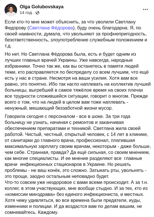 На захист Федорової виступила завідувачка кафедри інфекційних хвороб Національного медичного університету імені Богомольця Ольга Голубовська.