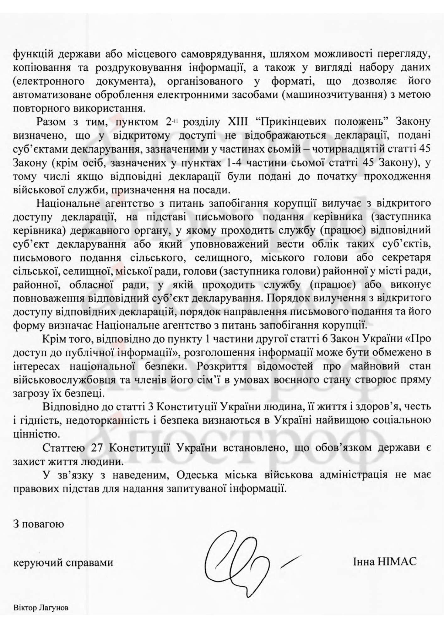 "Крім того, відповідно до пункту 1 частини другої статті 6 закону України "Про доступ до публічної інформації", розголошення інформації може бути обмежено в інтересах національної безпеки, - йдеться у відповіді МВА. - Розкриття відомостей про майновий стан військовослужбовця та членів його сім'ї в умовах воєнного стану створює пряму загрозу їх безпеці".