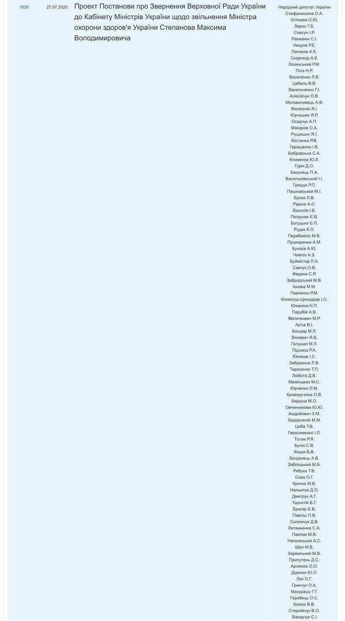 Проект постанови про звернення Верховної Ради до Кабінету міністрів про звільнення міністра охорони здоров'я Степанова підписали понад 90 народних депутатів з різних фракцій.