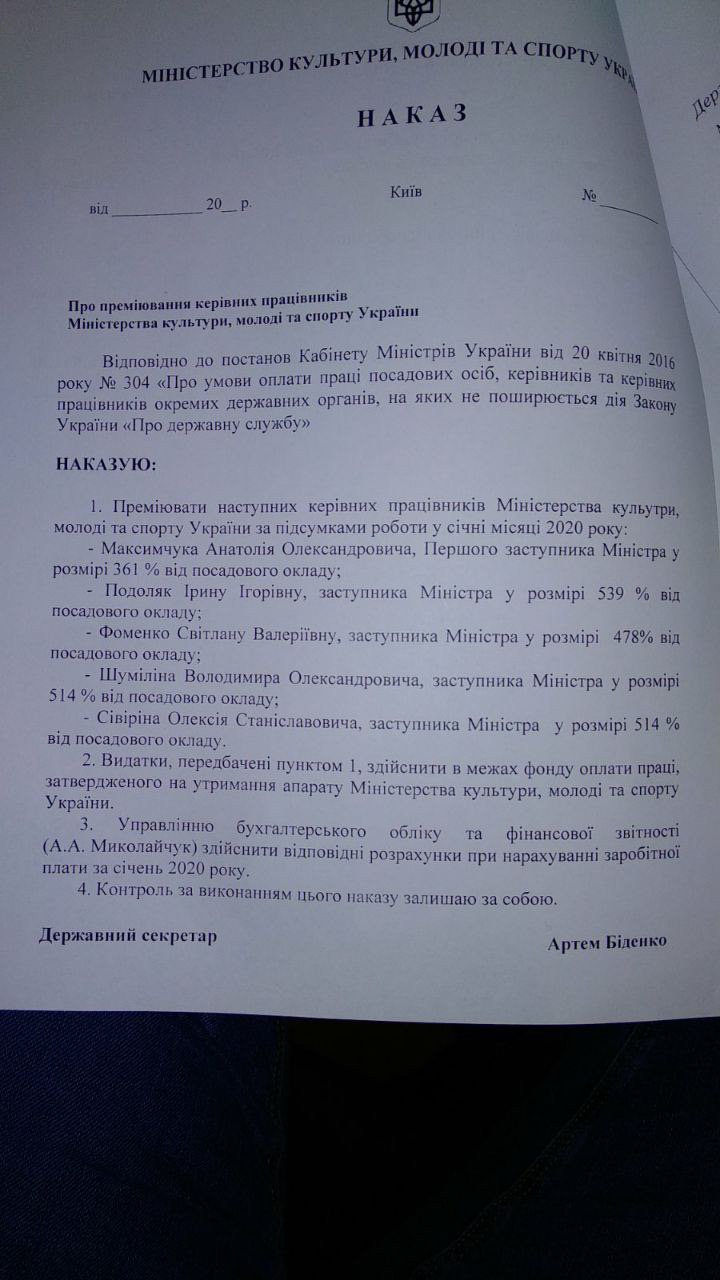 У мережі показали документ про премії для очильників Міністерства культури, молоді і спорту, через зарплати яких раніше розгорівся гучний скандал.