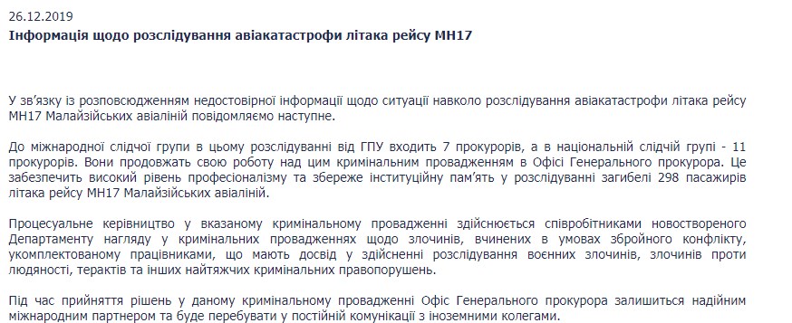 "У Міжнародну слідчу групу в цьому розслідуванні від ГПУ входить 7 прокурорів, а в національну слідчу групу - 11 прокурорів. Вони продовжать свою роботу над цим кримінальним провадженням в Офісі Генерального прокурора", - наголошується в заяві на офіційному сайті ГПУ.
