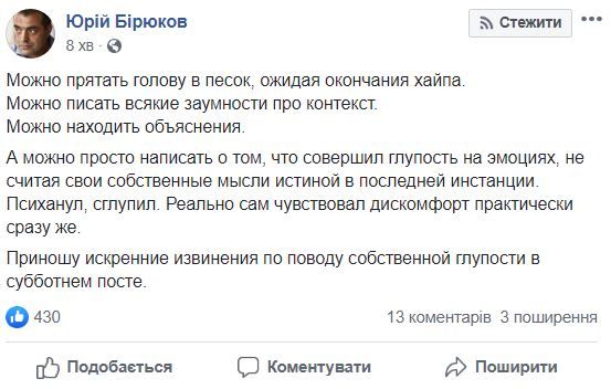 У своєму пості Юрій Бірюков назвав "виродками" військових, які проголосували за президента Зеленського. Через деякий час він видалив цю публікацію і написав пост з вибаченнями.
