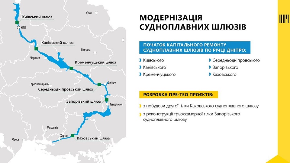 На судноплавних шлюзах Дніпра капітальні ремонти вже ведуться. На завершальній стадії роботи з модернізації пункту управління Київського шлюзу. У подальших планах – капітальний ремонт на решті 5 дніпровських шлюзів. На стадії попереднього техніко-економічного обґрунтування проєкти з побудови другої гілки Каховського та реконструкції трикамерної гілки Запорізького судноплавних шлюзів.