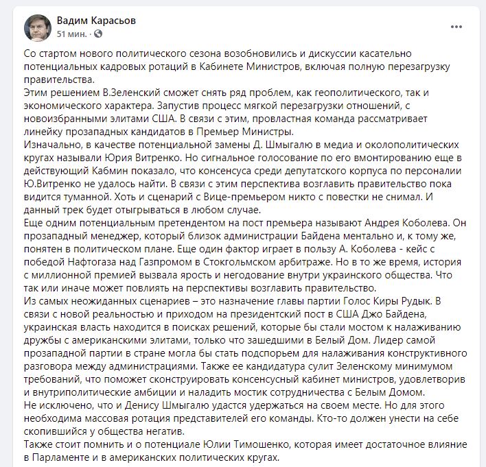 "Зі стартом нового політичного сезону поновилися і дискусії щодо потенційних кадрових ротацій в Кабінеті міністрів, включаючи повне перезавантаження уряду. Цим рішенням В. Зеленський зможе зняти ряд проблем, як геополітичного, так і економічного характеру. Запустивши процес м'якого перезавантаження відносин, з новообраними елітами США. У зв'язку з цим, провладна команда розглядає лінійку прозахідних кандидатів в прем'єр-міністри", - пише він.