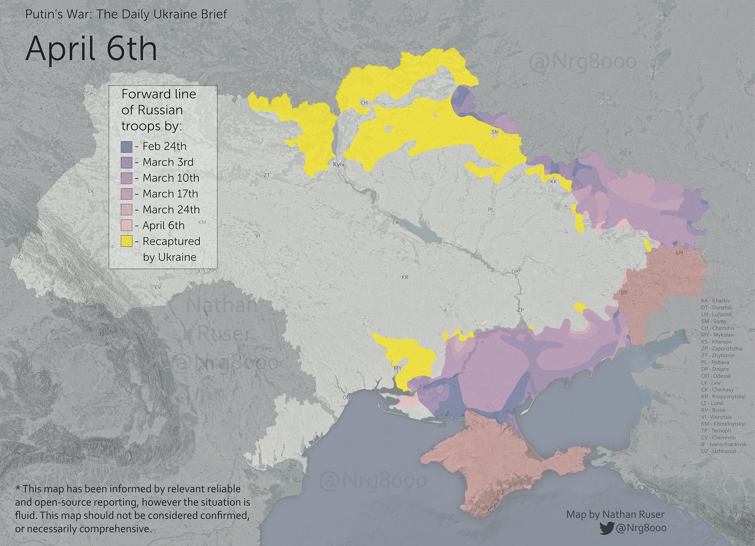 Минула 42-га доба протистояння українського народу російському вторгненню. На вечір середи, 6 квітня, ворог готує наступальну операцію на сході для встановлення повного контролю над територією Донецької та Луганської областей.