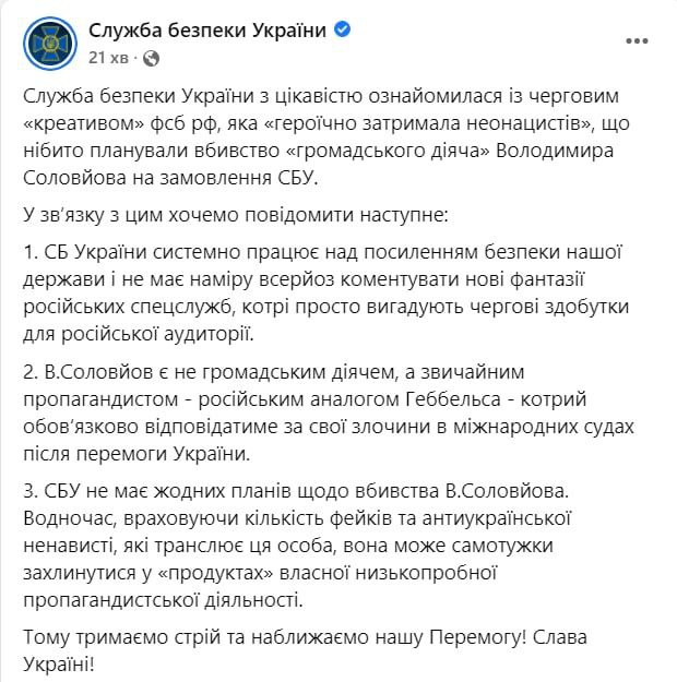 16:50 У СБУ відреагували на повідомлення ФСБ про свою "причетність" до підготовки вбивства російського пропагандиста Соловйова.