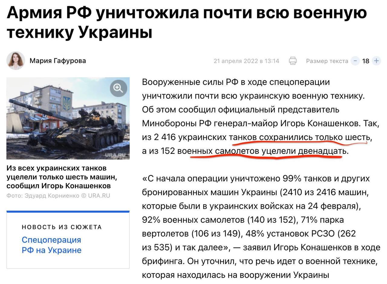 12:25 Російська пропаганда загнала себе в логічний глухий кут і оголосила, що знищила всі танки і майже всі літаки ЗСУ. Залишилося лише виграти війну.