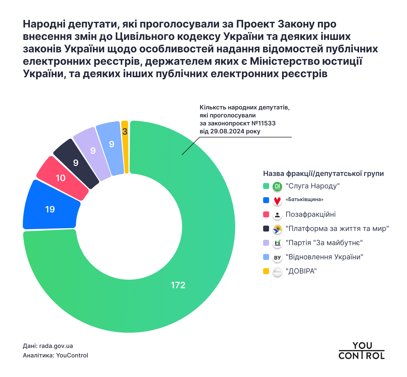 Фахівці YouControl дослідили, що підписані законопроєкти щодо обмеження доступу до відкритих даних (№11533 та №13420) підтримав 201 народний депутат Верховної Ради 9 скликання. А саме: