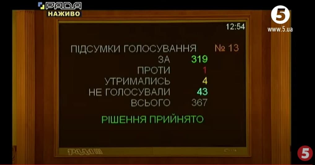 Верховна Рада схвалила в цілому законопроект №5123, за даний документ проголосували 319 народних обранців.